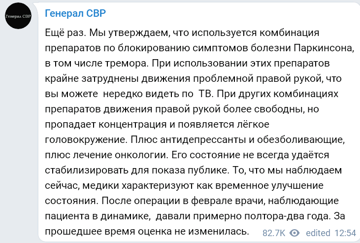 Не в смысле там Дмитрия Анатольевича Медведева или ещё кого-то там. А о самой обычной человеческой руке. Правой. У Президента Путина. Телеграм-канал "Генерал СВР" вещает нам якобы правду. Одну лишь правду и ничего кроме правды. Ну, может ошибутся там в медицинских терминах, ведь не медики всё-таки. Вещают якобы правду... Кстати, почему это "якобы"? Потому что автор ставит всё под сомнение. В том числе и на этом телеграм-канале. Но это не значит, что на этом канале врут везде. Может и вправду вещают эту самую правду. Но вначале, я всё равно поставлю под сомнение. А Время - мать Истины - покажет... со временем. Так вот на канале частенько вещают про правую руку Президента. И не только про неё одну, но и про здоровье нашего Президента в целом. Мол, хреноватое оно. Уже скоро сам объявит про него. А пока на обезболивающих... да, чего с их слов. Вот сами их слова: Перед этим на том канале ролик выложили, где наш Президент всё левой рукой двигает. Верится? После такого ролика начинает верить