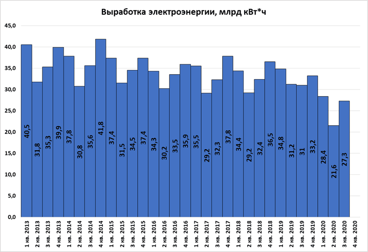По сравнению с 3 кв. 2019 года, выработка снизилась на 11,89%. Снижение потребления электроэнергии и теплоэнергии вызвано более высокой температурой воздуха в 2020 году, а также влиянием пандемии коронавируса. Высокой водностью и связанная с этим высокая загрузка ГЭС в ЕЭС России.