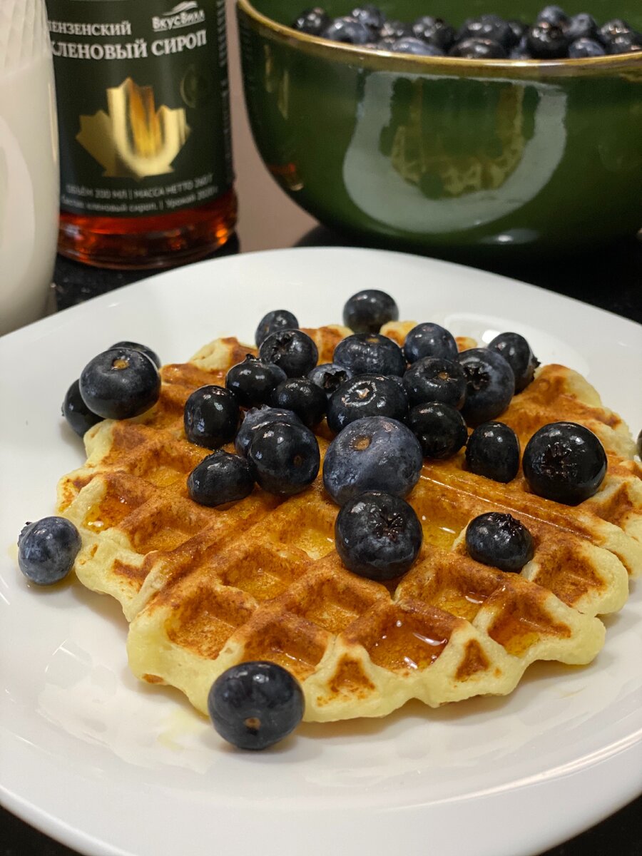 Блендером растираем банан и творог до однородной массы. Добавляем яйцо и кефир. Все хорошо перемешиваем и всыпаем муку. Снова все перемешиваем и выпекаем вафли. Вафли получаются хрустящими и зажаристыми. Я подаю с различным топпингом, например, с кленовым сиропом и голубикой. Приятного аппетита )