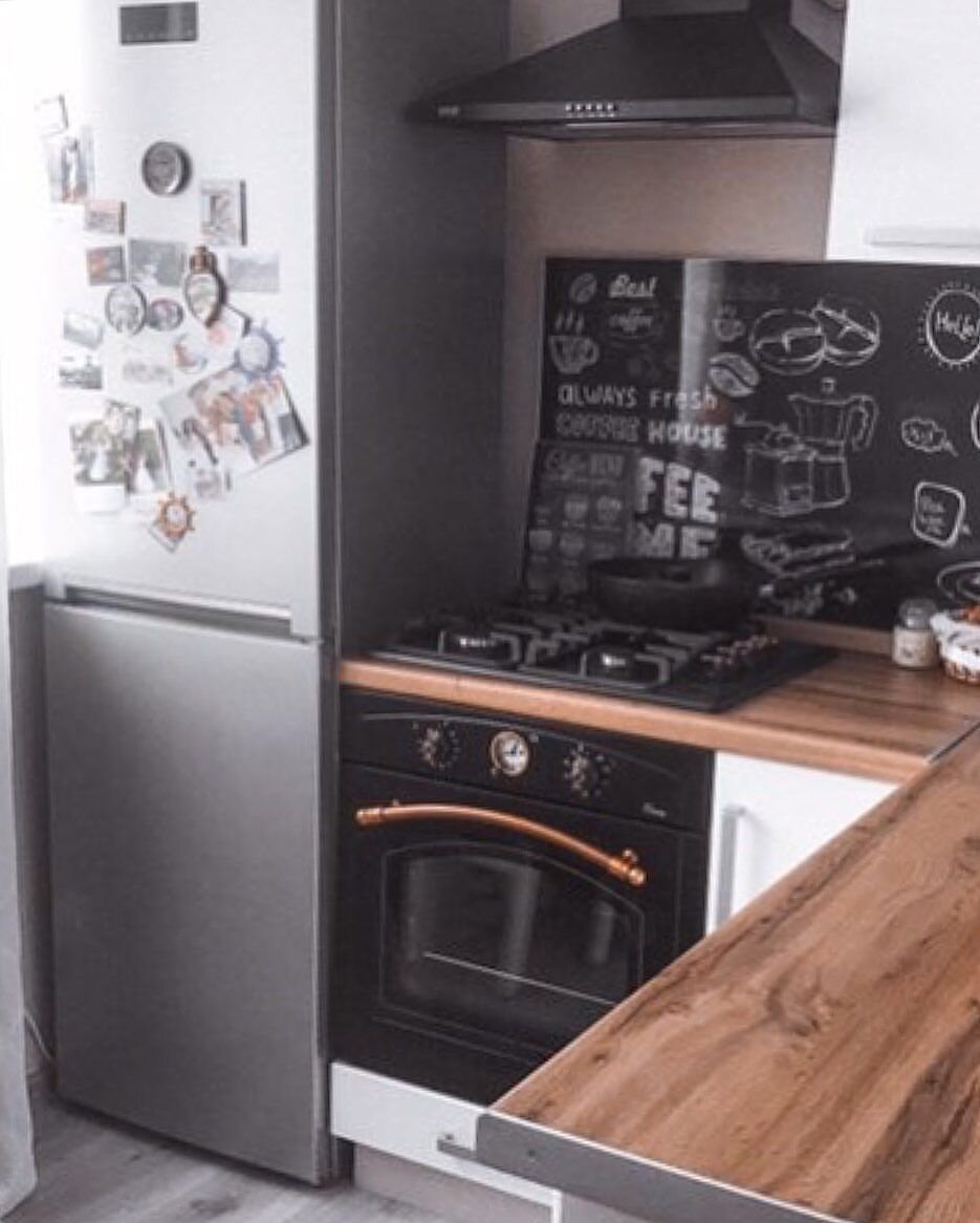 - стеновая панель с имитацией грифельной доски (бюджетное решение, которое 3-5 лет отслужит, если быть аккуратнее с задними конфорками газовой варочной)