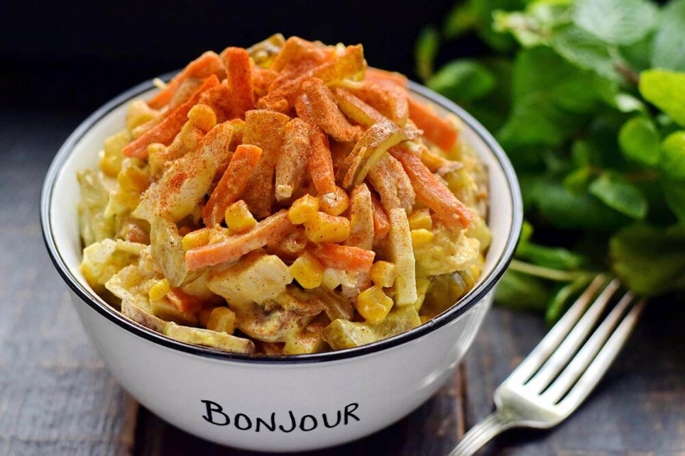 Все подготовленные компоненты сгрузите в подходящий по размеру салатник. Консервированную кукурузу процедите от маринада, добавьте в основной состав.