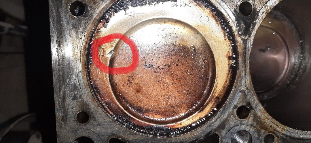 В данном случае погнуло один клапан, он столкнулся с поршнем и оставил отпечаток. На фотографии это видно.