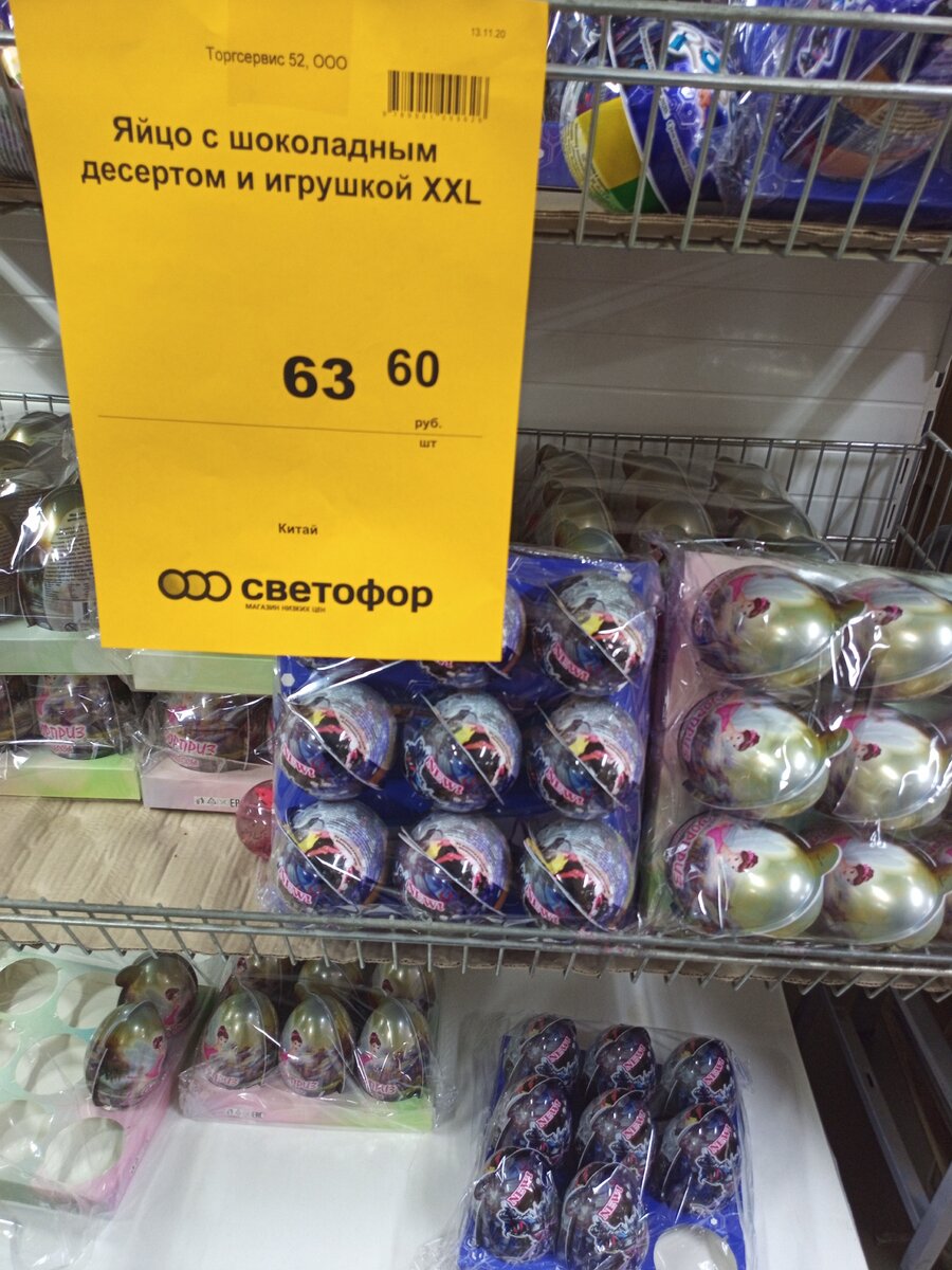 Зашли в Сфетофор купить химию для дома и посмотреть на новинки. Рядом с кассой заметили большие яйца с сюрпризом для детей за 63,6 рублей. Взяли на пробу для мальчика и девочки.