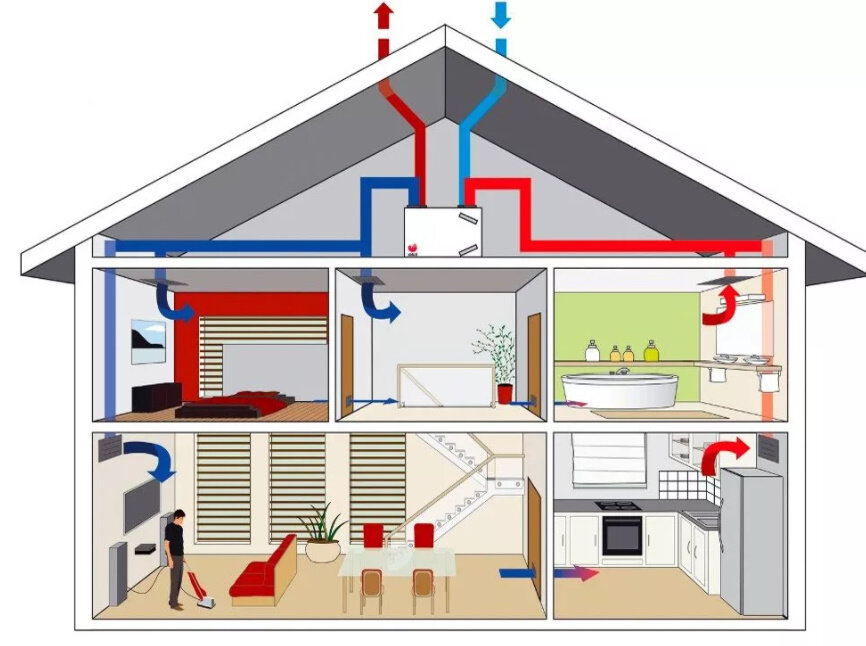 Выходит переработанный воздух либо через вентиляционные естественные отверстия и ходы в санузле, кухне и ванной. С помощью вентилятора можно выполнить принудительный отток переработанного воздуха.
