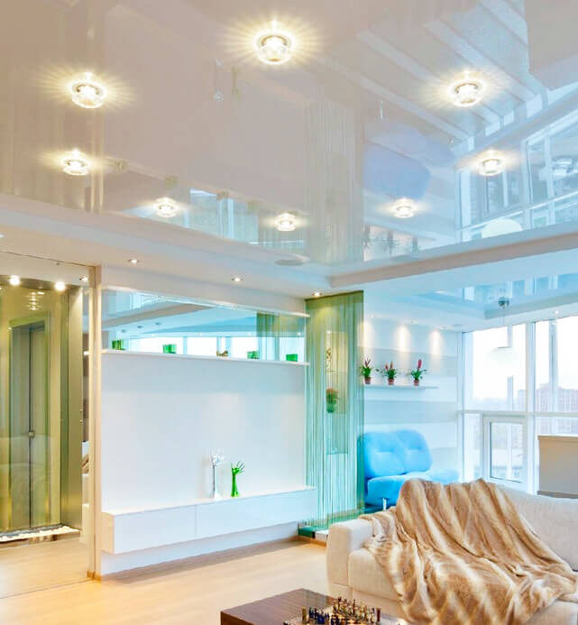 Данный вид потолочного покрытия является самым лучшим решением для жилого или общественного помещения, а также ванных комнат и бассейнов. В последних случаях вся сконденсировавшаяся влага соберется на потолке, капли воды будут переливаться на свету. При выборе глянцевых потолков учитывайте, что данное покрытие хорошо использовать в освещенных посещениях. К ним отлично подойдут светодиодные ленты, точечные светильники или какие-нибудь необычные люстры.