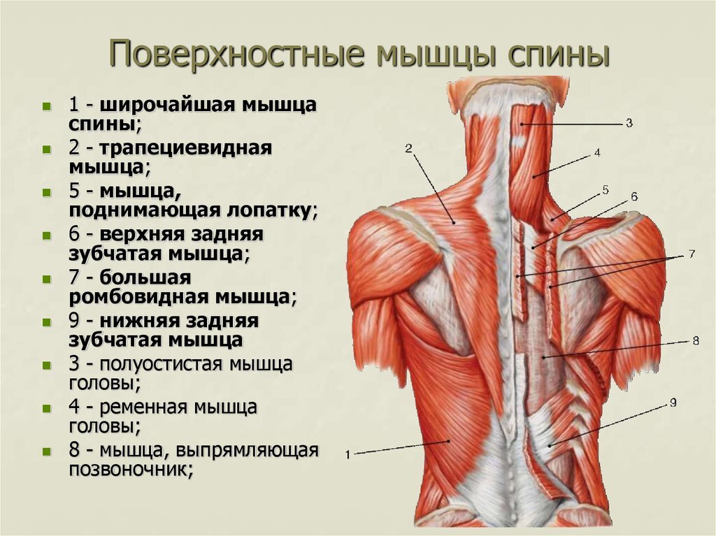 Спина представляет собой попарно сгруппированные мышцы, оплетающие заднюю часть корпуса. Они делятся на две большие группы: