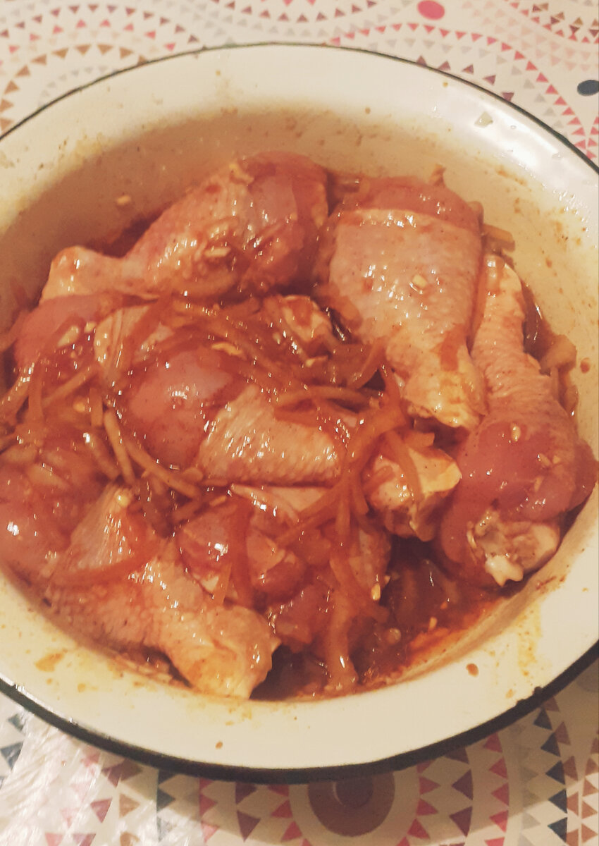 1. Лук нарезаем соломкой и мнем его, чтобы он дал сок. Чеснок мелко рубим. Добавляем к курице.