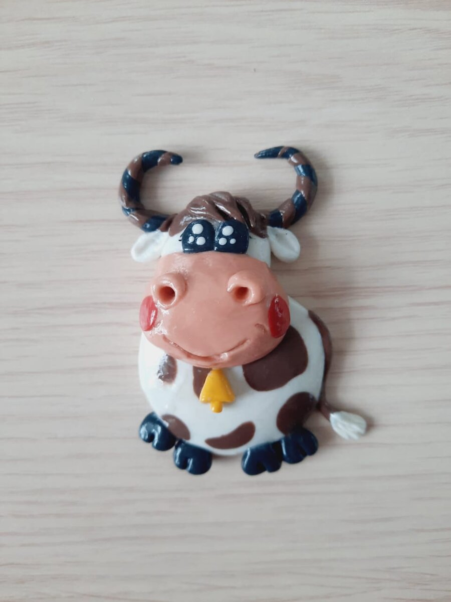 Вот и готов мой бычок. Осталось только подождать, пока глина просохнет, покрыть акриловым лаком и с обратной стороны приклеить магнит.