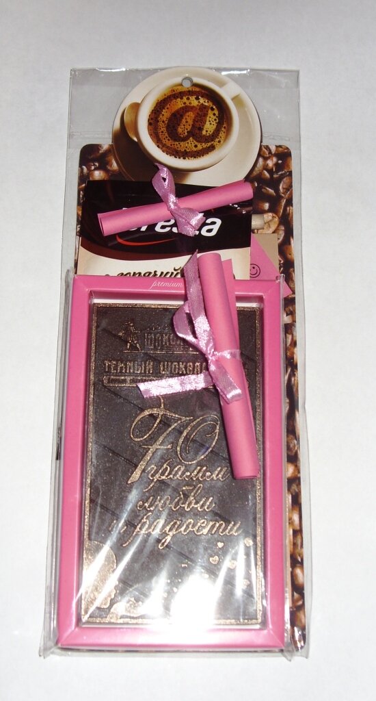 К шоколадке прикрепите надпись «Волшебный шоколад» и свёрнутую трубочкой и перевязанную ленточкой инструкцию, в которой указано: «Этот шоколад кажется совершенно обычным, но на самом деле это не так. Помимо того, что это 70 г любви и радости, это ещё и 100% волшебства в каждом кусочке! Желания загадывать можно в любое время дня и ночи! Эффект усиливается, если запивать шоколад кофе или горячим молоком».