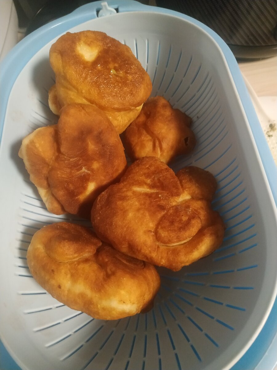 Когда пончики слепили, наливаем масло (200-300мл)на сковороду, и ждём когда нагреется масло, когда масло нагрелась, жарим наши пончики, жарятся они очень быстро, каждая сторона примерное по минуте, как зарумянилась сторона, переворачиваем на другую, как та поджарилась, выкладываем на дуршлаг, чтобы лишнее масло стекло.