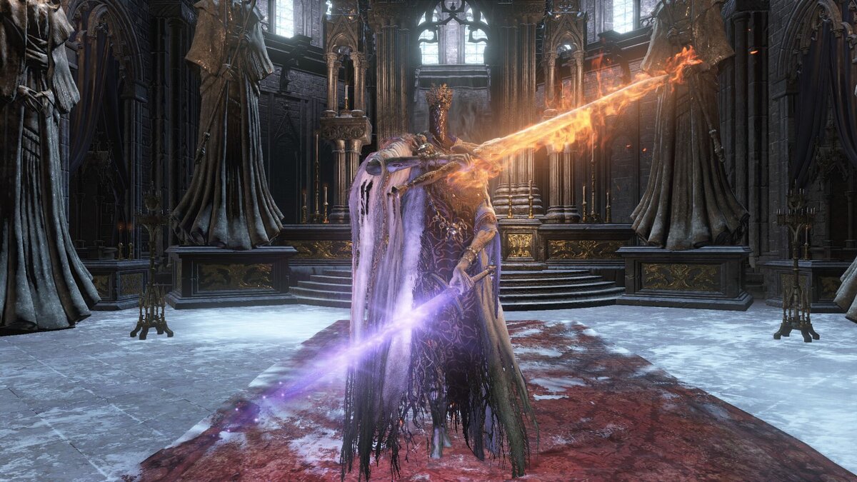 - Финальный Босс игры и довольно хорошо сделанный.что тут сказать:много здоровья,сильные и быстрые атаки,4 стиля боя и две полоски здоровья.Про стили это Меч,Сабля,Копьё и Посох.Атаковать босса желательно на стилях Копья и Посохе,так как он долго менее быстрый и долго атакует.Самый наверно сильный стиль это Сабля,быстрые сильные атаки,а также атаки пиромантией.После снятия полного здоровья вторая фаза,полное здоровье,а также новые атаки такие как атака с воздуха и молниями.Самая опасная атака на 2 фазе это комбо из пяти ударов огненным мечом с очень длинным выпадом.Самый безопасный способ слить босса на 2 фазе это уворачиваться от всех его атак и после комбо огненного меча,быстро бежать на босса и наносить ему урон.Правда это очень долго,но больше шансов выжить и победить.