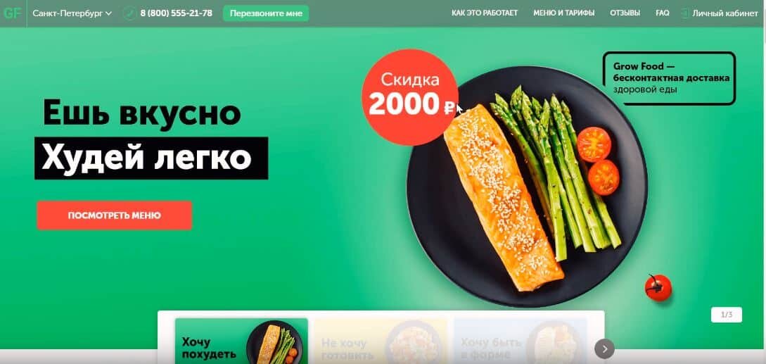 Рассмотрим на примере GrowFood – сайта по доставке готовой еды на неделю. Кратко обращу внимание на важные триггеры и блоки.