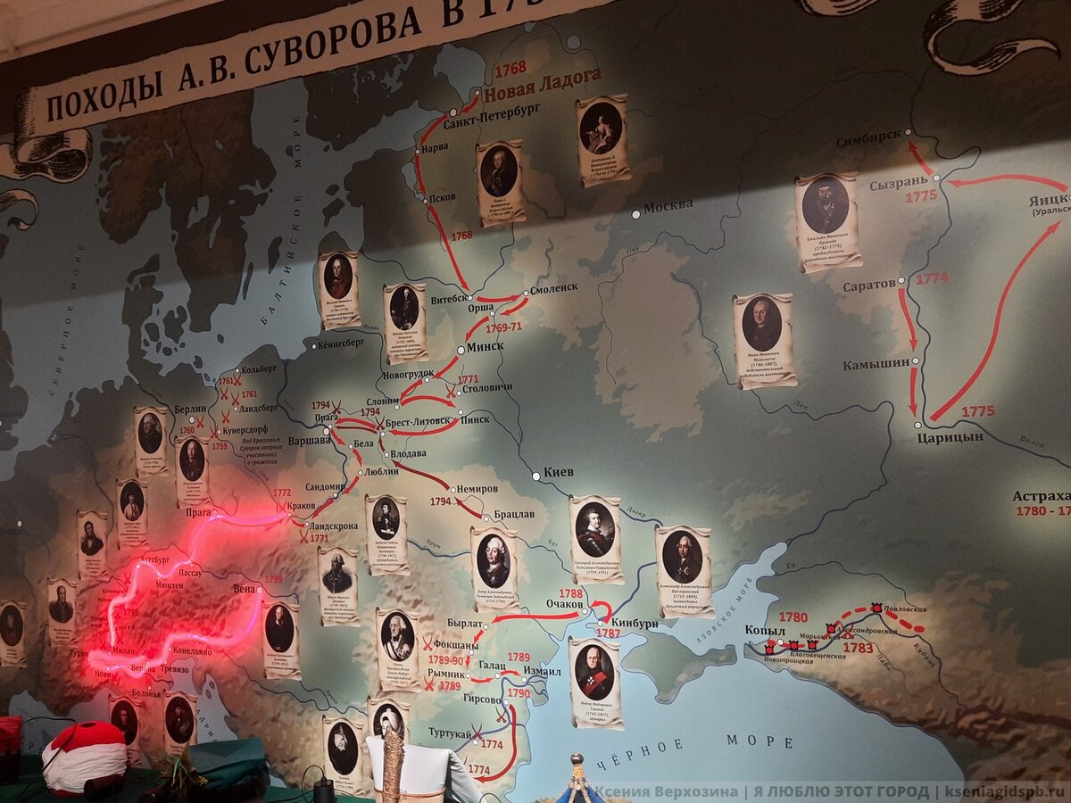 Рядом с каждой "шапкой" - слуховая трубка. Когда её берешь в руки, на карте загорается маршрут и табличка с кратким описание похода. А в самой трубке звучит текст писем от Суворова к Екатерине II, в которых он рассказывает подробности соответствующей кампании.