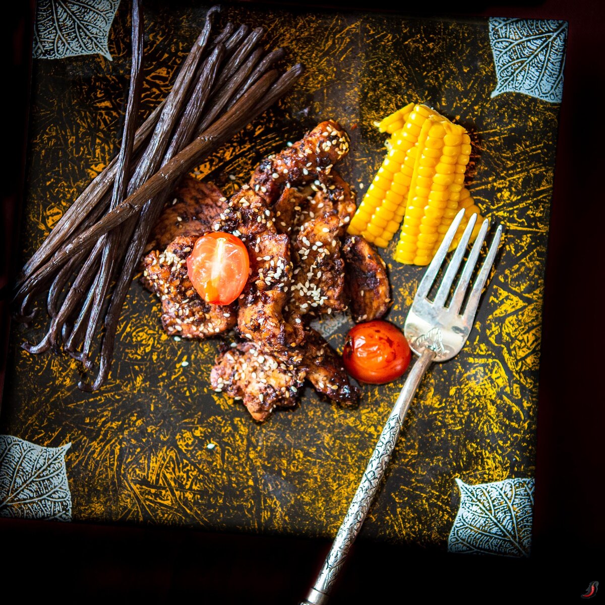 Кусочек (с коровий носочек) индейки, стручок ванили, немного кунжутного масла и соевого соуса, имбирь, чеснок, жгучий перец, коричневый сахар, лайм, кунжут для украшения блюда и бурбонский перец.