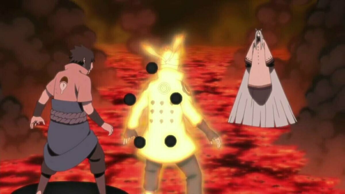 Серии с 458 по 474. Это самая масштабная битва за всё существование Наруто. Битва происходит в период четвёртой мировой войны. Когда Мадара радуется своей победе, со спины на него нападает черный Зецу, который был еще одним "Дитём" Кагуи. В результате появляется Кагуя Оцуцуки. Она является представительницей клана Оцуцки. Кагуя прибыла на Землю вместе с Ишики Оцуцуки в поисках плода Божественного Древа, чакру которого она должна была предоставить главной ветви клана в другом мире. Но она влюбилась и не выполнила свою задачу. Вообщем как по мне это самая зрелищная битва во всём аниме.