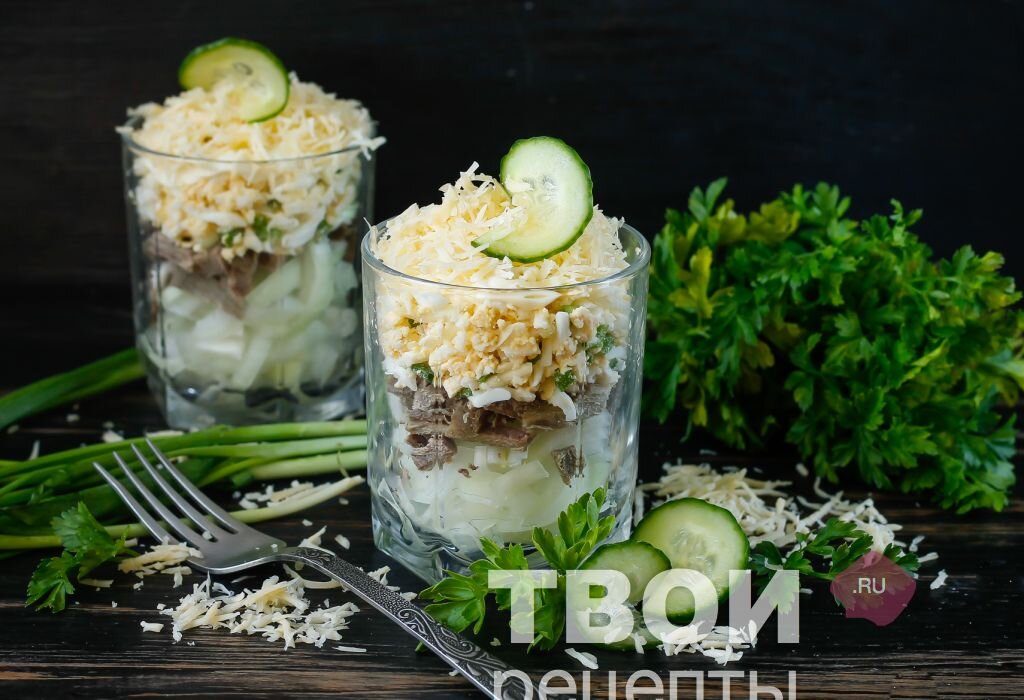 2 - Маринованный лук отжать и выложить в стаканы или в глубокую емкость, в которых вы собираетесь выслаивать салат.