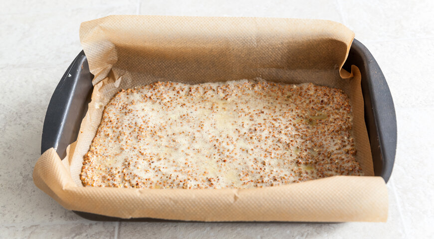 Гречневую крупу перетирают с сырыми яйцами, кладут тонким слоем на большое блюдо,