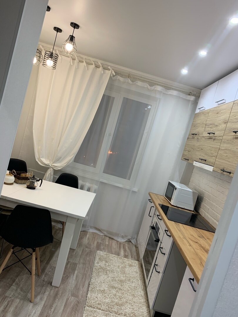 Нижняя часть фасадов полностью белая, выделяются лишь чёрные минималистичные ручки и стекло духового шкафа, который хозяева нашли белый. Пустое пространство осталось, как я понимаю, для посудомоечной машины. У окна поставили микроволновку, а рядом встроили электрическую варочную панель. Над неё встроили духовку, получив при этом дополнительное место для хранения за дверцей шкафа.
