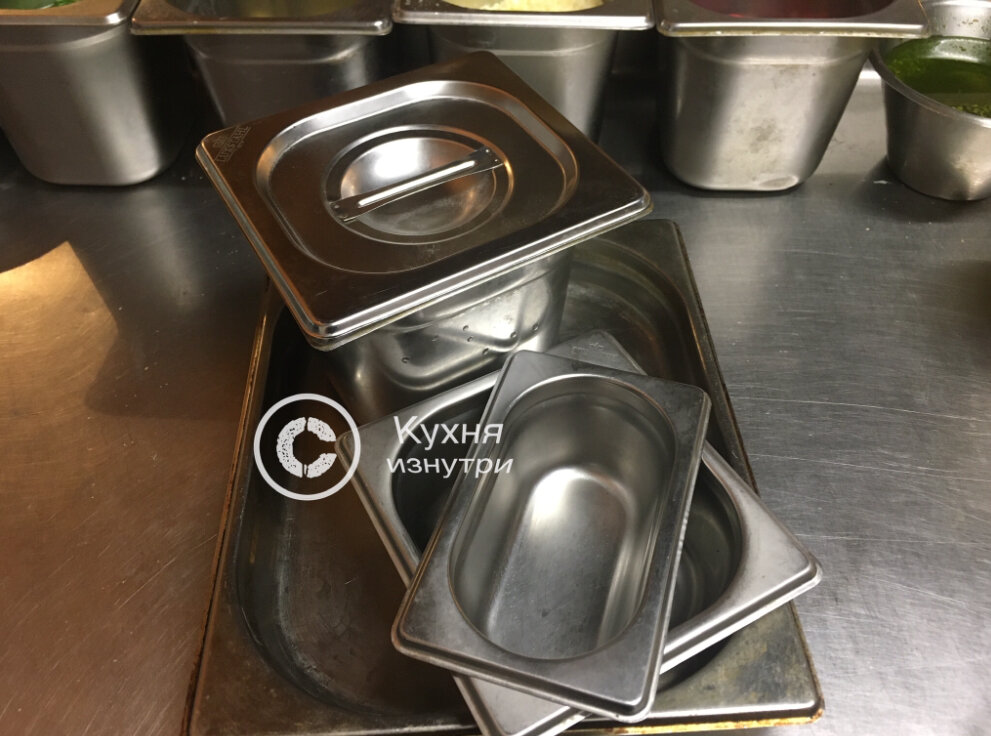 На фото ниже видно, что гаспоёмкости хорошо помещаются в холодильные витрины и мармиты и имеют крышки в наличии.