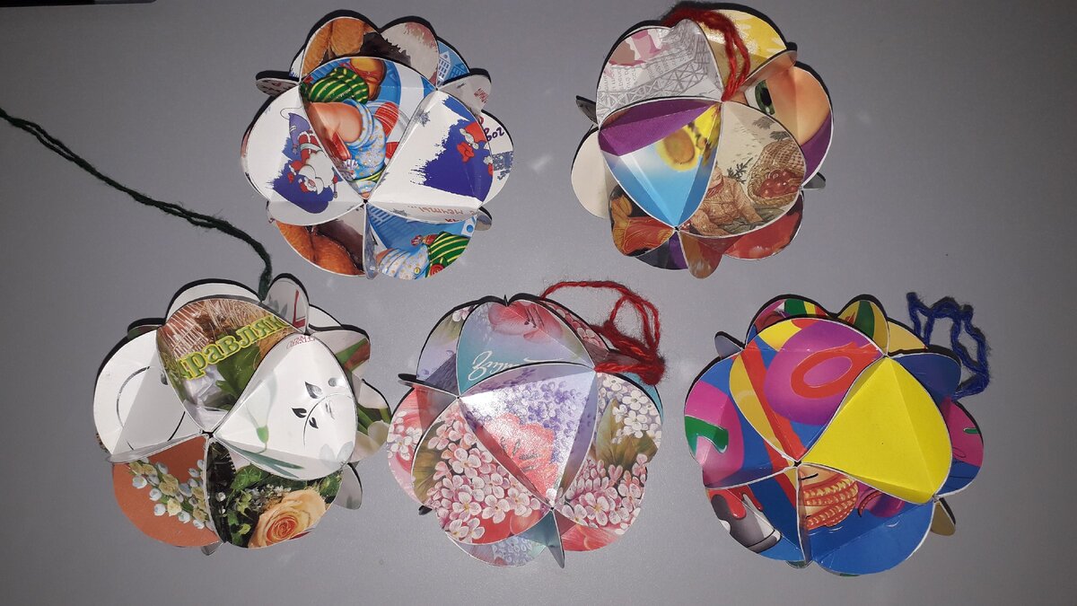 Делать такие шары меня научила мама. Помню, как мы вместе с мамой и сестрой их клеили. Раньше было очень много открыток, к праздникам все рассылали поздравления своим родственникам и друзьям. Мы никогда не выбрасывали открытки, использовали их для творчества.