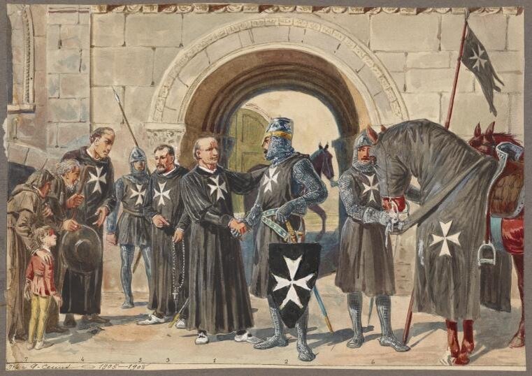 Рыцари присоединились к обществу в конце XI века; причём этот эпизод окутан тайной. Госпитальеры оказали некую услугу предводителю крестоносцев герцогу Готфриду Бульонскому, что за услуга – осталось неизвестным, но с 1099 года общество было преобразовано в орден, получил земельные владения и к нему присоединились рыцари, в том числе высокого ранга. Они носили узнаваемую длинную одежду с белым «хвостатым» крестом.