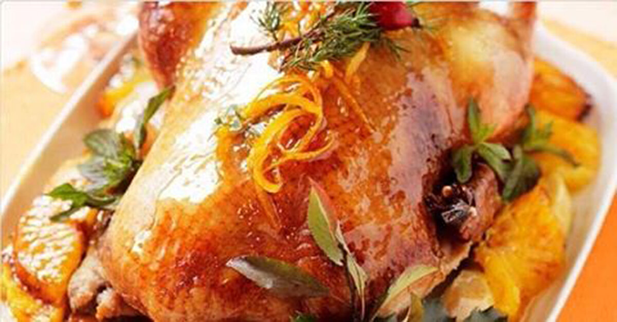 6. Сливаем медово-фруктово-соевый сок в чашку, достаем птицу из духовки и сливаем из противня жирный сок в отдельную банку (потом пригодится для супчиков). Противень протираем салфеткой, часть фруктов кладем птице в брюшко, часть раскладываем вокруг птицы. Любители особенных ароматов могут положить сверху фруктов чуток (1-2 веточки) розмарина. Саму же почти готовую птаху поливаем медовым соусом. Увеличиваем огонь в духовке до 180-200 градусов и отправляем всю эту вкуснотень в жар, еще минут на тридцать-сорок.