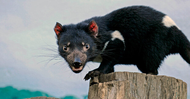 Окраска у тасманийских дьяволов черная, у 75% особей присутствуют две белых полулунных отметины: одна на груди, вторая – на пояснице.относится к отряду Сумчатых и на данный момент является в нем самым крупным хищником.Охраняемых индивидуальных участков у них нет, но одна особь, как правило, перемещается по определенной территории, отдыхая в 3-4 постоянных логовах. Укрытиями тасманийским дяволам служат густые кустарники, норы, которые они роют сами, или небольшие пещеры. На окраинах поселков эти звери иногда воруют одеяла, одежду и выстилают этими вещами свои убежища. Звери ведут одиночный образ жизни, поскольку обладают сварливым и неуживчивым характером. Единственное, что может собрать тасманийских дьяволов вместе, это крупная добыча. Ради пропитания они готовы потерпеть соседей, но только после того как хорошенько накричат друг на друга и выяснят, кто главнее. Морды старых особей испещрены шрамами, напоминающими о таких стычках. Сумчатые дьяволы выходят на охоту только ночью и в сумерках, но в неволе активны днем.