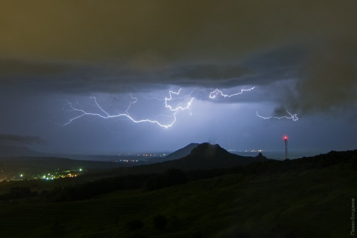 Внизу показались расчерченные лесополосами поля; неровная лохматая кромка облаков ушла вверх. Открылся горизонт с башнями грозовых туч, упиравшимися в стратосферу своими наковальнями. Впереди величавыми клубами медленно поднималась синяя стена близкой грозы; под нею висели неряшливые седые лохмы осадков, пронизываемые бледно-синеватыми змейками молний.