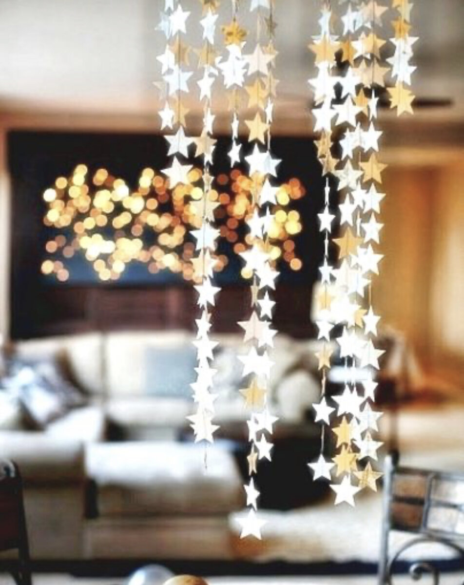 Прекрасно будет смотреться и водопад из снежинок, елочек или же звезд в дверном проеме или же на стене.