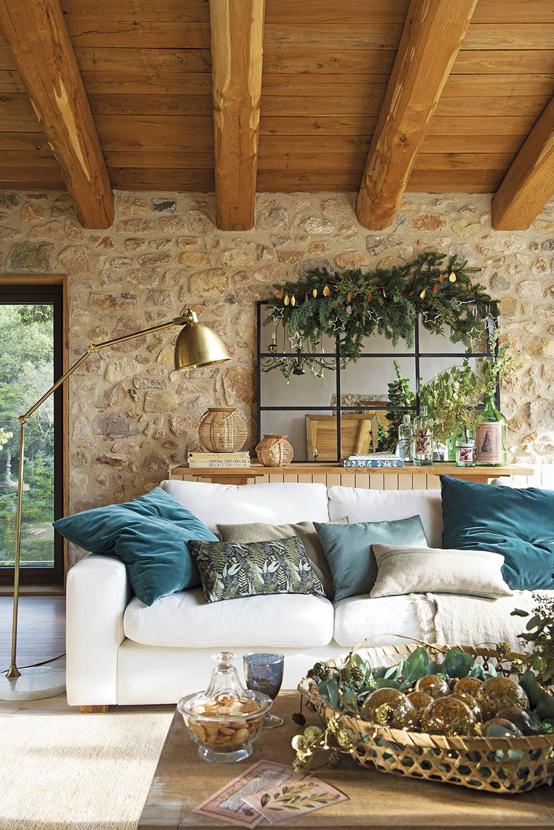 Как сделать так чтобы интерьер не был перегружен деталями и в тоже время, чтобы в нем чувствовался дух праздника. Ответ на этот вопрос наверняка точно знает владелец этого праздничного испанского дома. Главное — сделать рождественский декор максимально близким к стилю дома. Здесь это рустик. Ёлку украшают золотые и зелёные шарики, а по всему дому расставлены букетики и композиции. Снег в этих