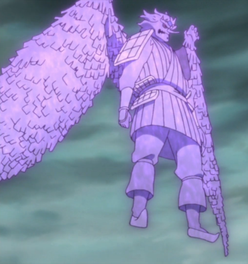 Сусано Саске имеет пурпурный цвет из-за его чувства ненависти. В завершённой форме Сусано имеет крылья и позволяет летать. Основным оружием Сусано является Лук. Самый Слабый из Сусано