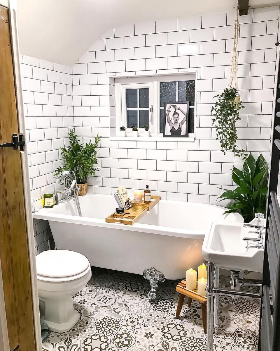 В этой ванной прекрасен пол. Также гармонично смотрится деревянная полочка с принадлежности для купания. Свечи добавляют ванной комнате романтичности.