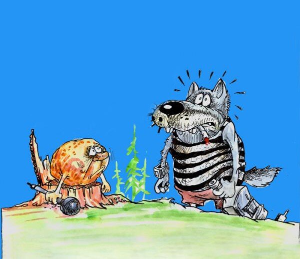 Откинулся колобок с тюряги. Катится по лесу, ему на встречу Волк.