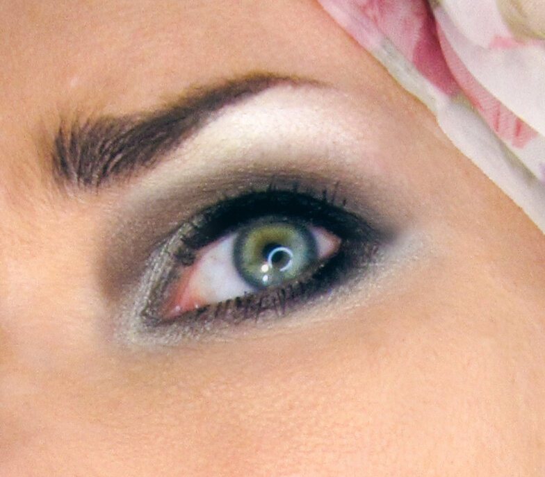 А тут - в процессе. До макияжа глаз - тональный крем, крем-корректор (самодельный) и пудра, которая все закрепляет. И уже по этому слою рисуется остальное - тогда и тени, и подводка, и карандаши держатся отлично. При таком способе одинаково хорошо держатся и высококачественные тени для век, и совсем дешевые, среди которых тоже есть неплохие.