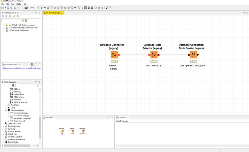 Для того, чтобы подцепить KNIME к СУБД и что-то вытащить, в самом простом варианте нужны 3 ноды: