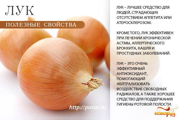 Сразу хотелось бы отметить, что репчатый лук является достаточно сильным природным антибиотиком. Особенно актуальны данные свойства лука в зимний период, когда значительно учащаются всевозможные инфекционные и простудные заболевания. При всем этом для профилактики болезни и при уже имеющихся симптомах насморка или ОРВИ лук не только употребляют внутрь, его так же вдыхают. Для этого просто разрезается головка луковицы на несколько частей, а затем вдыхаются его поры. Используют лук и при головных болях, при общей слабости, ревматизме, гипертонии, гастрите, диабете и геморрое. Кроме всего прочего очень полезен лук для мужчин, ведь он способствует предотвращению онкологических заболеваний, в частности, предстательной железы.