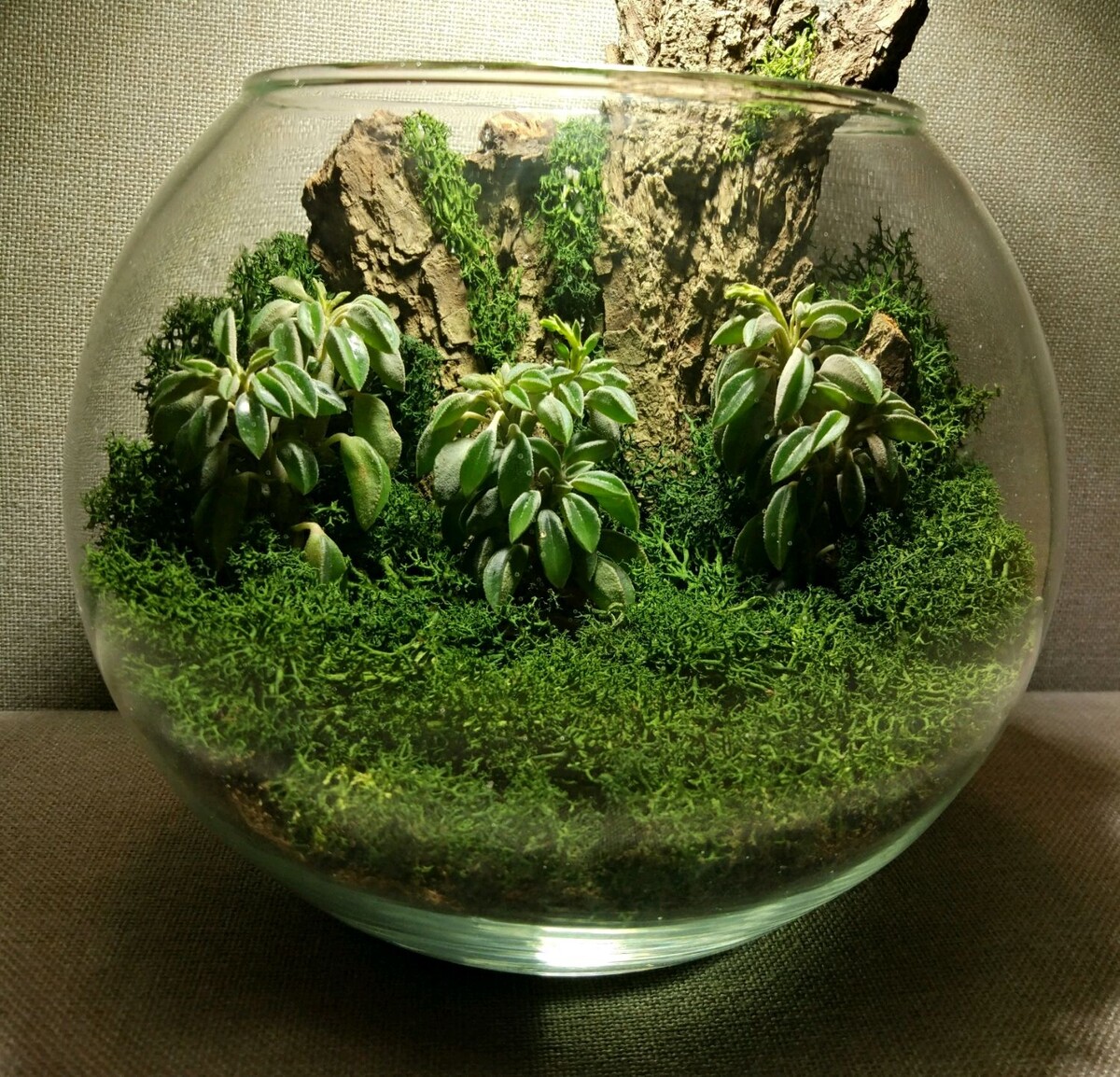 Для закрытых садов, у которых свой микроклимат, лучше всего использовать растения, которые отлично приспособлены для роста в тени, это нефролепис, пилея, бегония, мох и многие другие. Так же есть виды слабо растущих кактусов, которые отлично вписываются в любой интерьер.