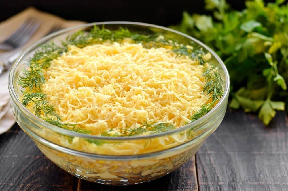 Этот салат относится к простым салатам быстрого приготовления из небольшого количества продуктов, его можно назвать бюджетным. Однако в нем есть некая изюминка, которая делает его по необычному вкусным. Его легко можно подавать на торжественные столы, даже больше, он станет коронным блюдом на празднике. Салат состоит из трех слоев, каждый пропитан майонезом. Здесь главное, не придавливать слои,