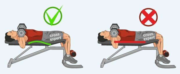 Возьмите гантели и лягте на скомью, лопатки сведены в пояснице
