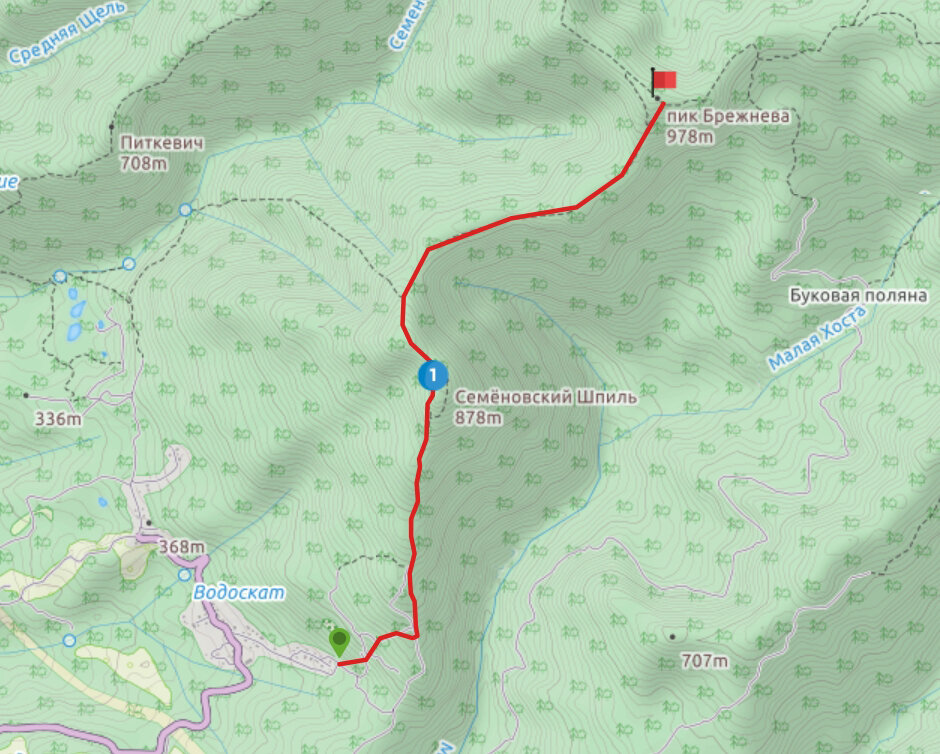 Высота начала маршрута — 410 метров. Мы начали идти в 10:48. Удобную тропу мы сначала пропустили, потому что я не смотрел на карту и шёл туда, где дорога была просто шире. Пришлось потом идти через кусты. Я даже хотел написать в исполком, что дорогу на такую гору нужно благоустроить, но вскоре мы вышли на главную тропу, и она хороша:
