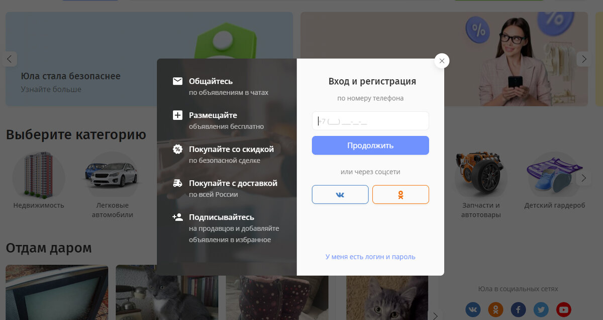 Для регистрации в Юле нужен номер телефона или аккаунт в социальных сетях. Покупателю с продавцом предоставляется возможность для выбора общения: