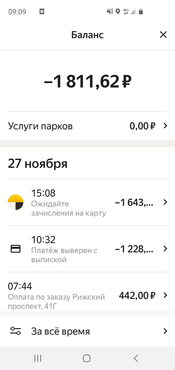 Дело собственно вот в чём.Работал я исправно практически целый месяц и тут выдалось 2 дня выходных.В первый день мне перевели часть суммы с таксометра,и на следующий день её остаток. А вот на балансе после всех отчислений,у меня нарисовался минус,в размере -1811 рублей.