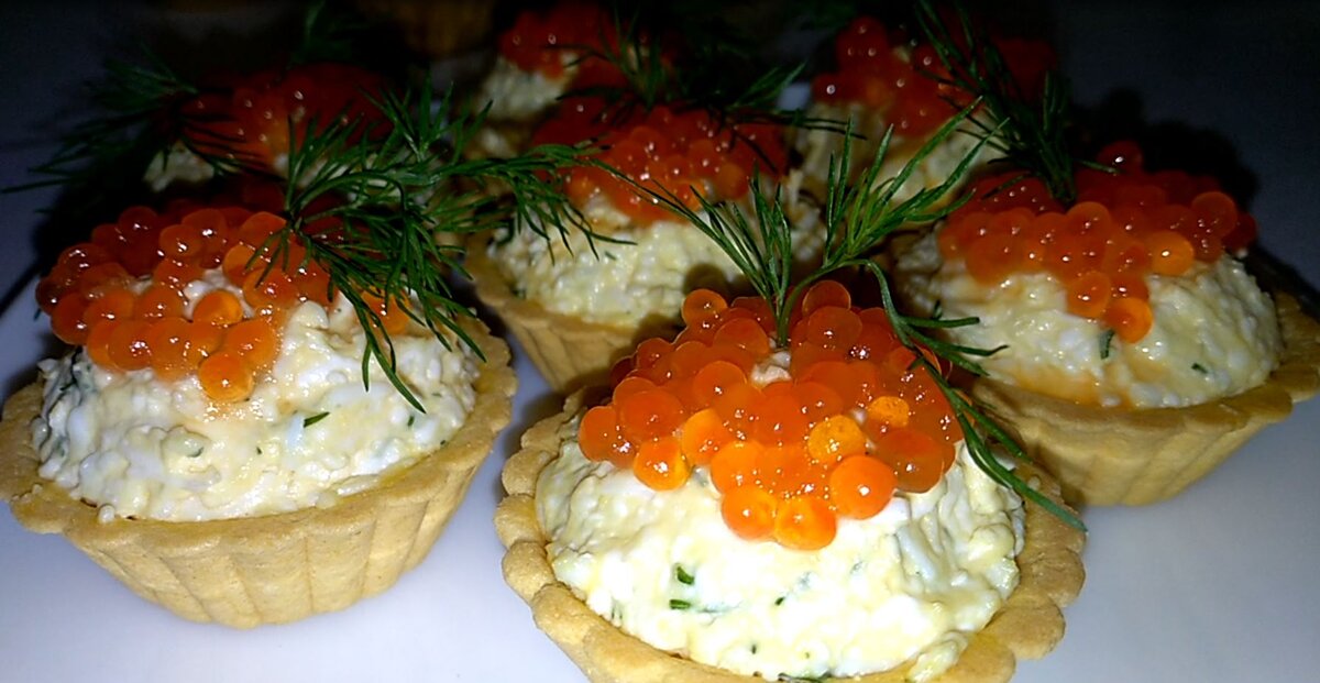 Простая в приготовлении, очень вкусная и красивая закуска на праздничный стол. Тарталетки с сырно - чесночной начинкой, украшенные икрой с укропом.