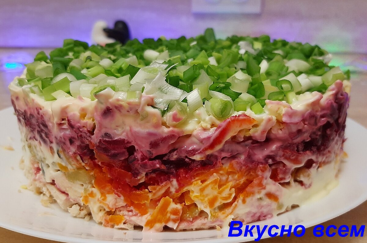Добро пожаловать на мою кулинарную страничку! Хочу поделиться с вами рецептом замечательного салата "Новогоднее волшебство", который украсит любой новогодний стол. Этот салат не только очень вкусный и сытный, но еще и необыкновенно красивый. Он обязательно привлечет внимание ваших гостей! Легкий, яркий, простой в приготовлении салат - это находка для хозяюшек, которые хотят удивить своих родных и близких. ******************************************************************************* Ингредиенты: ******************************************************************************* Приготовление: 1. Куриное филе, морковь и свеклу необходимо сварить в подсоленной воде. Яйца так же отварить. 2. Салат слоеный: Поставить салат на 2-3 часа в холодильник, чтобы он как следует пропитался и можно подавать к столу! ******************************************************************************* Вкусных и приятных вам моментов!