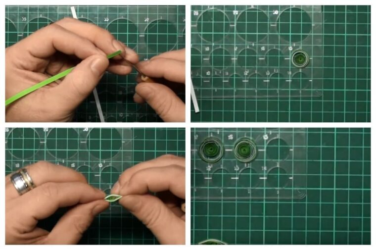 2. Склеиваем ещё четыре заготовки. Скручиваем спирали. Помещаем их в те же окружности.