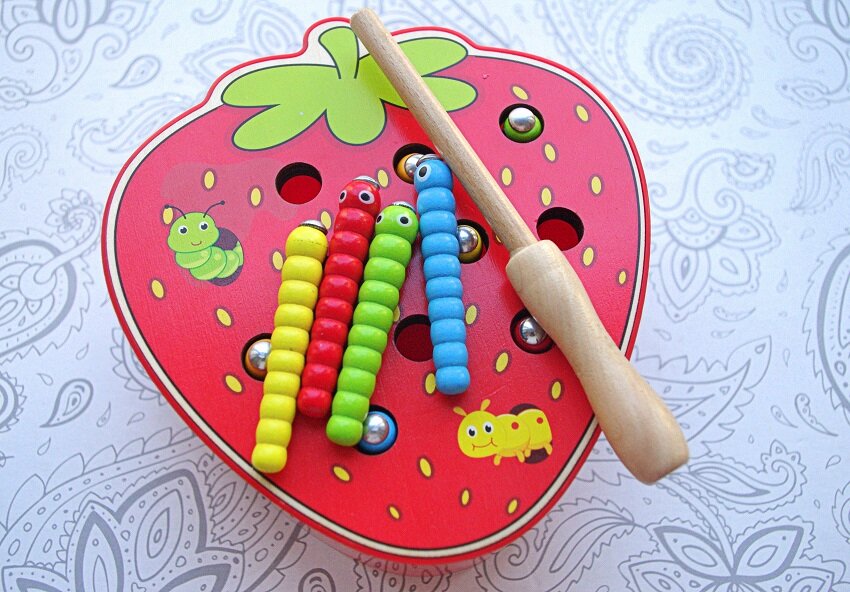 1. Первая в списке – это клубничка с деревянными червячками, которых из нее нужно вытаскивать деревянной удочкой с магнитиком на конце.
