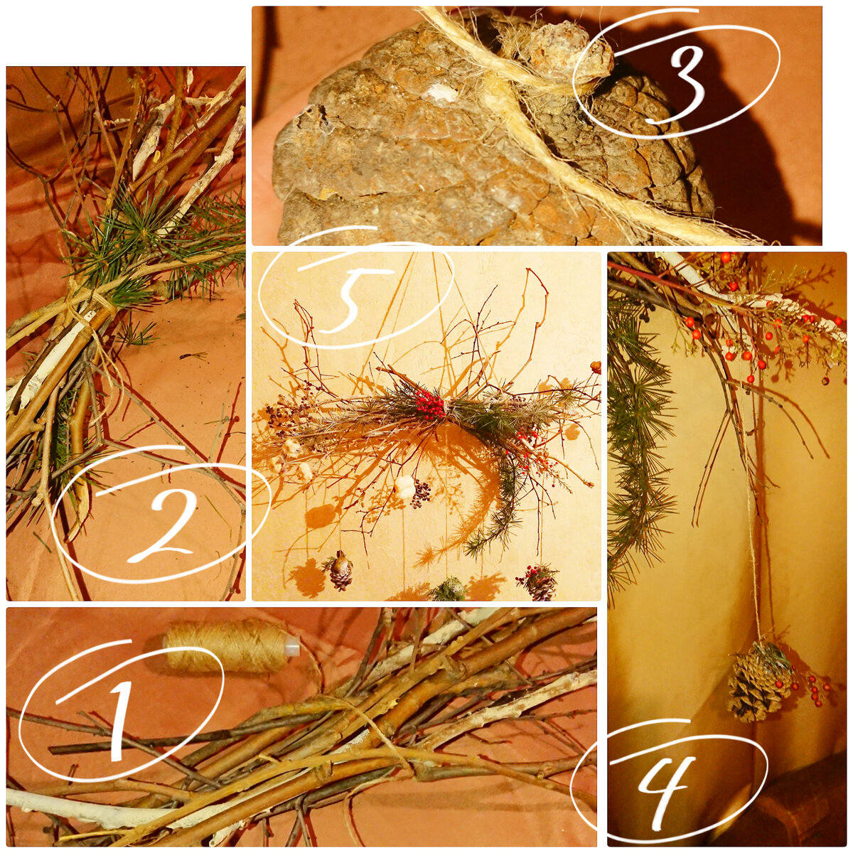 Для этой композиции вам всего то и понадобится : ,хворост , шишки, ягоды и джутовая веревка!