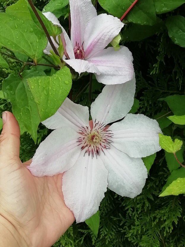 2. Туям нужно много воды, а клематисам застой вреден. Но у меня приподнятые клумбы у клематисов, там застоя воды точно нет. И летом соперничества то же нет. Туи деликатно притеняют "ноги" клематисов, я мульчирую перегноем, влаги хватает для роста и цветения.