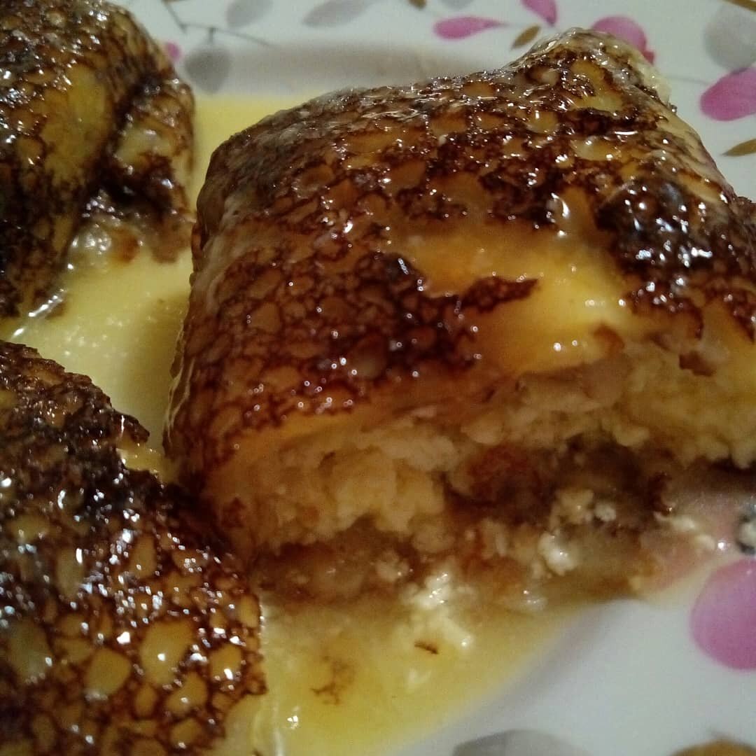 В общем, печём блины по вашему любимому рецепту. Делаем начинку из творога, сахара и 1 яйца. Начиняем блины.