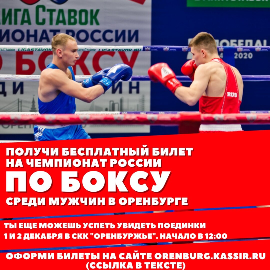 ИДЕМ БЕСПЛАТНО на Чемпионат России по боксу среди мужчин в СКК «Оренбуржье»! У вас есть возможность получить билеты на поединки 1 и 2 декабря, которые начинаются в 12:00. На чемпионате нашу область представляют 9 боксеров. По итогам состязаний будет сформирован состав национальной сборной для участия в Олимпийских играх в Токио.